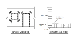 ⑦并在所有陰陽(yáng)角、門(mén)窗洞口板縫處要設(shè)加強(qiáng)網(wǎng),陰陽(yáng)角處用角網(wǎng),門(mén)窗洞口用不小于600MM的平網(wǎng)呈45度角放置補(bǔ)強(qiáng),用扎絲將其綁扎牢固,見(jiàn)下圖: